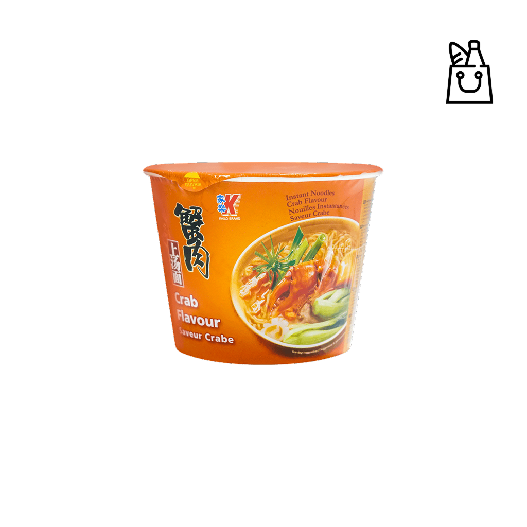 These are crab-flavored instant dry noodles—similar in style to a typical noodle soup bowl. Packaged with a noodle cake and two seasoning sachets (a dry seasoning packet and an oily sauce packet), it’s ready to eat by adding hot water. The product is made in China.